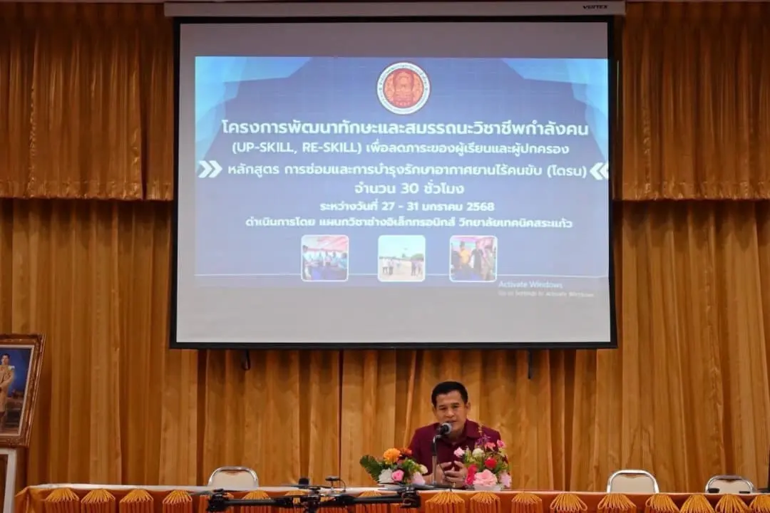 ศูนย์การฝึกอากาศยานไร้คนขับกองทัพอากาศ (RTAF-UTC) และ กองบิน 3 ให้ความรู้ในโครงการพัฒนาทักษะและสมรรถนะวิชาชีพกำลังคน (UP-SKILL,RE-SKILL) ร่วมกับวิทยาลัยเทคนิคสระแก้วเมื่อวันที่ 29 มกราคม 2568 ณ ห้องประชุมแก้วเจ้าจอม วิทยาลัยเทคนิคสระแก้ว นาวาอากาศเอก ทรงศักดิ์ ธรรมสาร ผู้บังคับการกองบิน ๓ มอบหมายให้ เรืออากาศเอก ถิรเดช ภูภัทรธราวุฒิ นำข้าราชการ กองบิน ๓ ที่มีทักษะ ความรู้ ความสามารถ ในด้าน อากาศยานไร้คนขับ เข้าร่วมอบรมให้ความรู้ในโครงการพัฒนาทักษะและสมรรถนะวิชาชีพกำลังคน (UP-SKILL,RE-SKILL) โดยมีวัตถุประสงค์เพื่อถ่ายทอด ความรู้ ความสามารถเกี่ยวกับอากาศยานไร้คนขับ ทั้งนี้ยังสามารถปรับตัวเข้ากับการเปลี่ยนแปลงของอุตสาหกรรมและเทคโนโลยีได้ในอนาคต